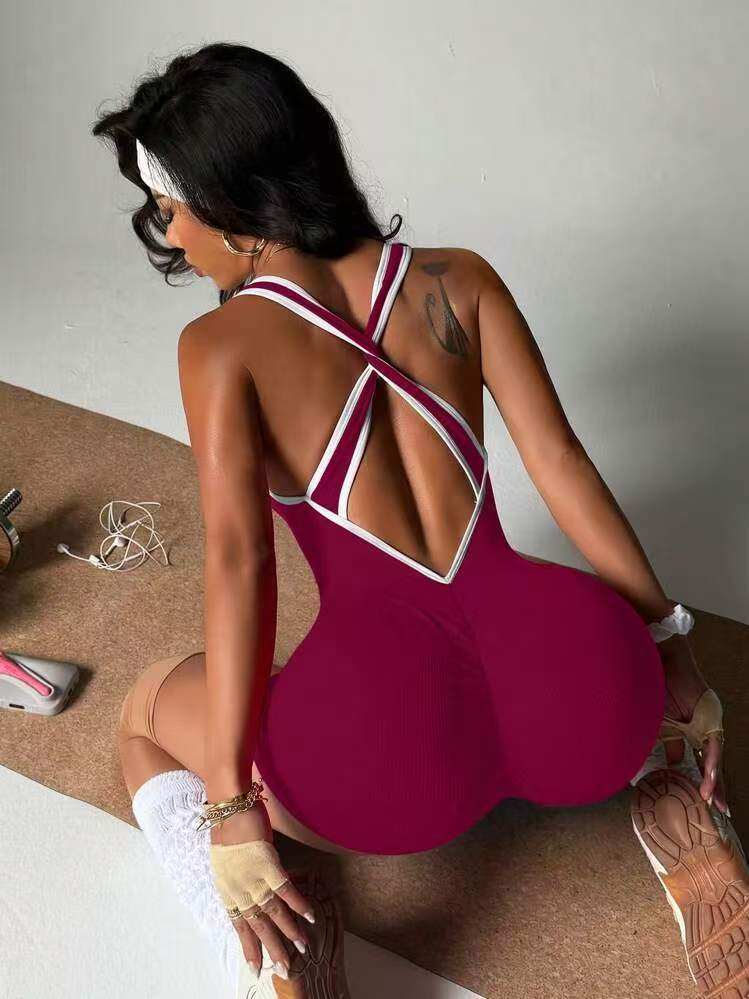 Özellikler: Şık scrunch bum (kıvrımlı kalça detayı) tulum, çapraz sırt tasarımı ile